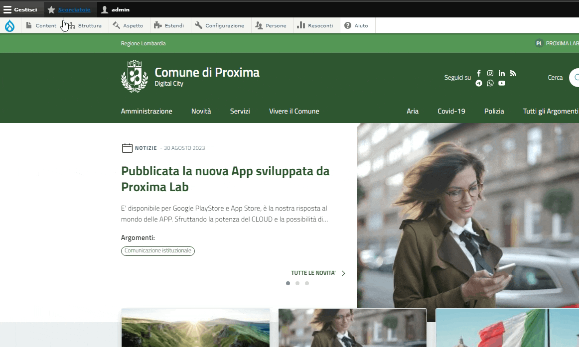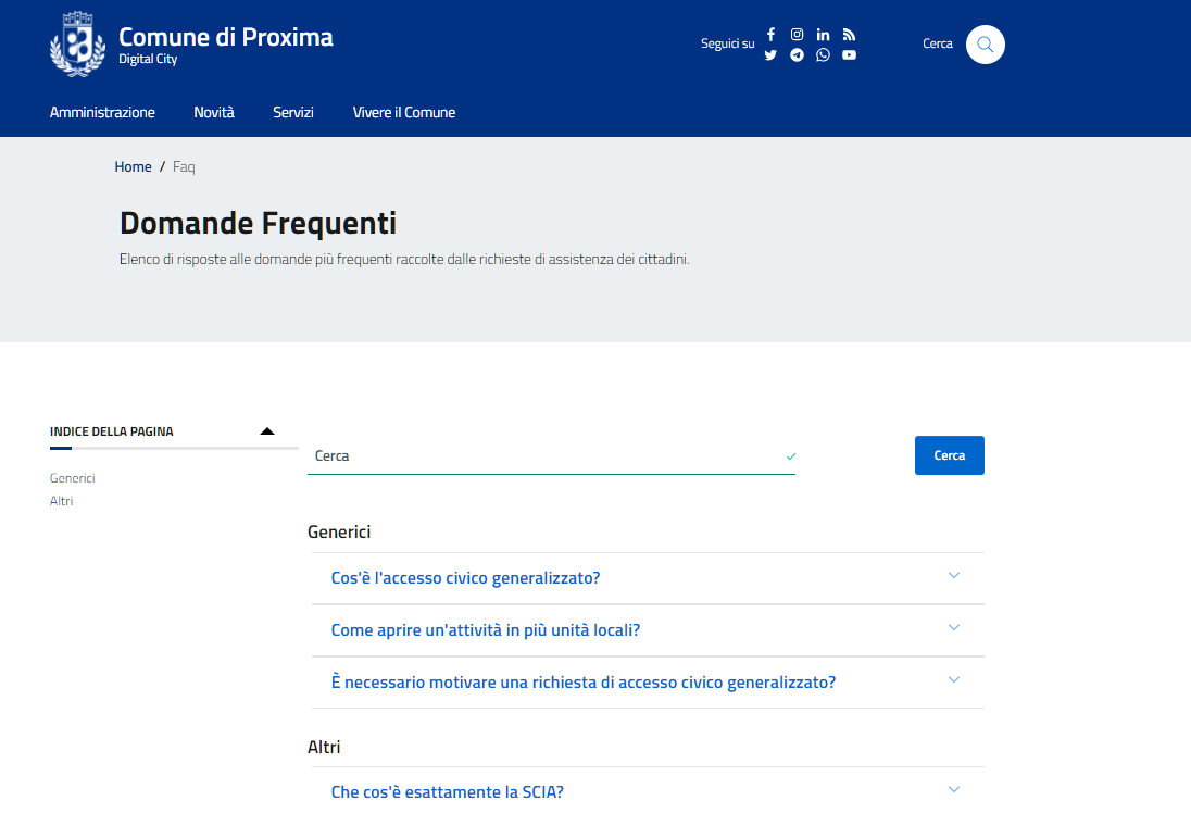 Questo contenuto permette di creare delle Faq, ovvero delle frequently asked questions (Domande frequenti) che verranno pubblicate nella sezione dedicata raggiungibile dal footer (il piè di pagina) del sito, e che potranno essere raccolte per argomento.