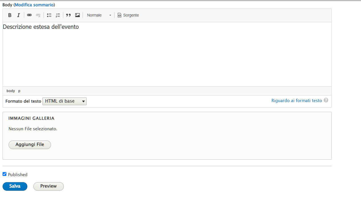 Per caricare le immagini della gallery, cliccare "Aggiungi file" nel box Immagini Galleria.